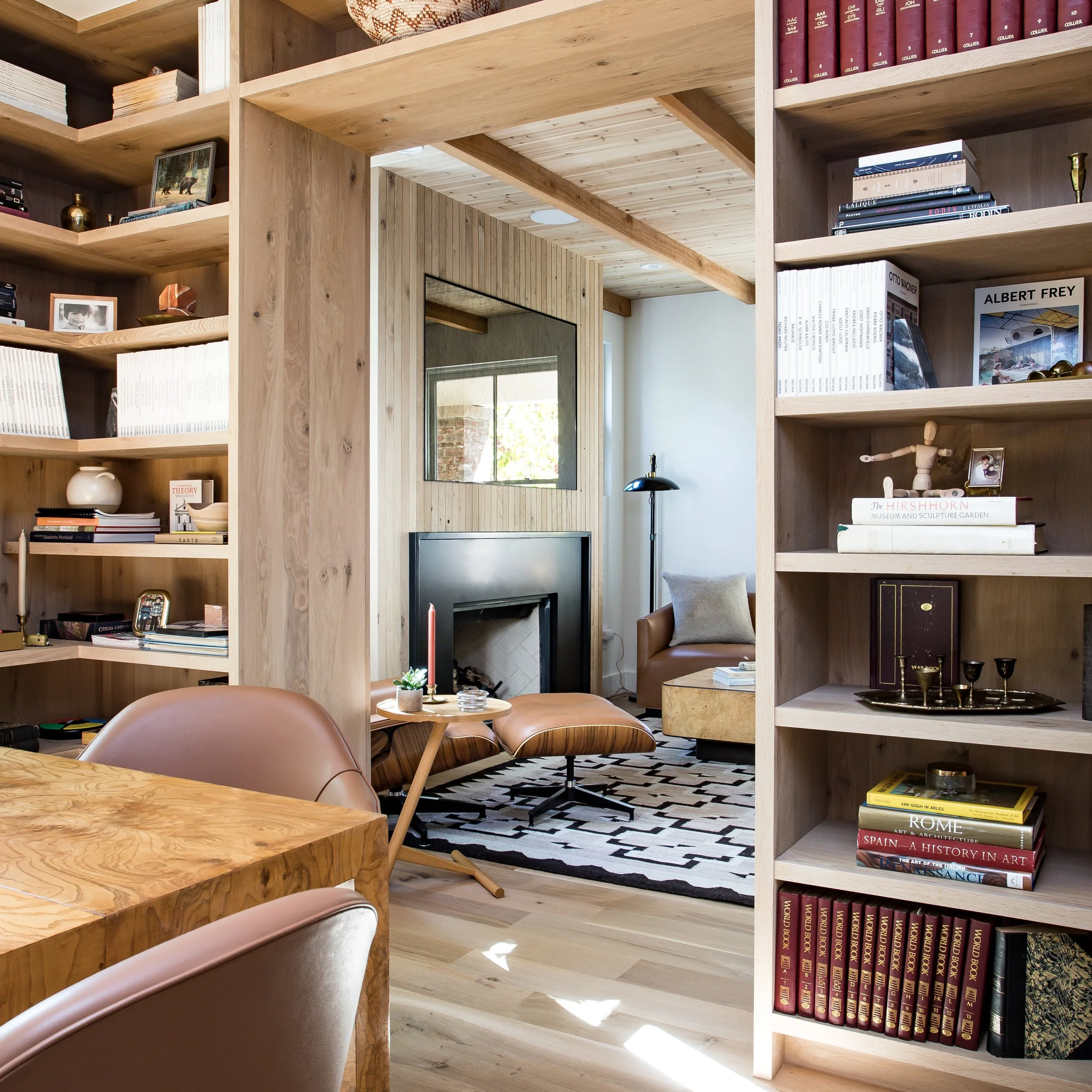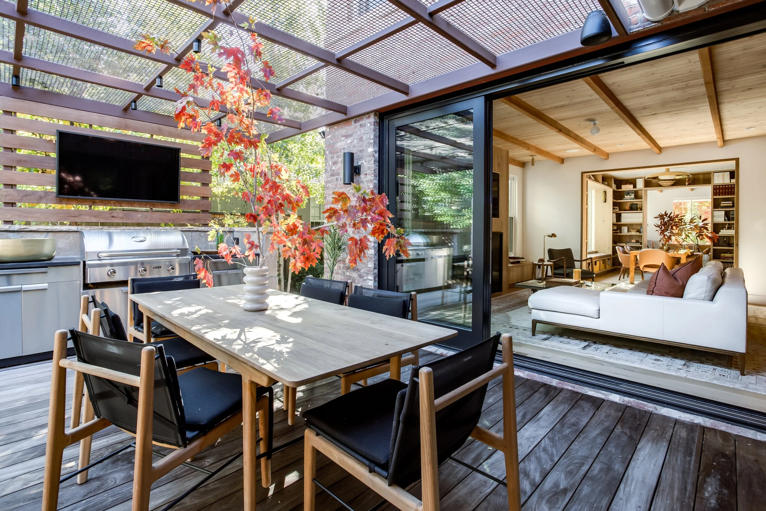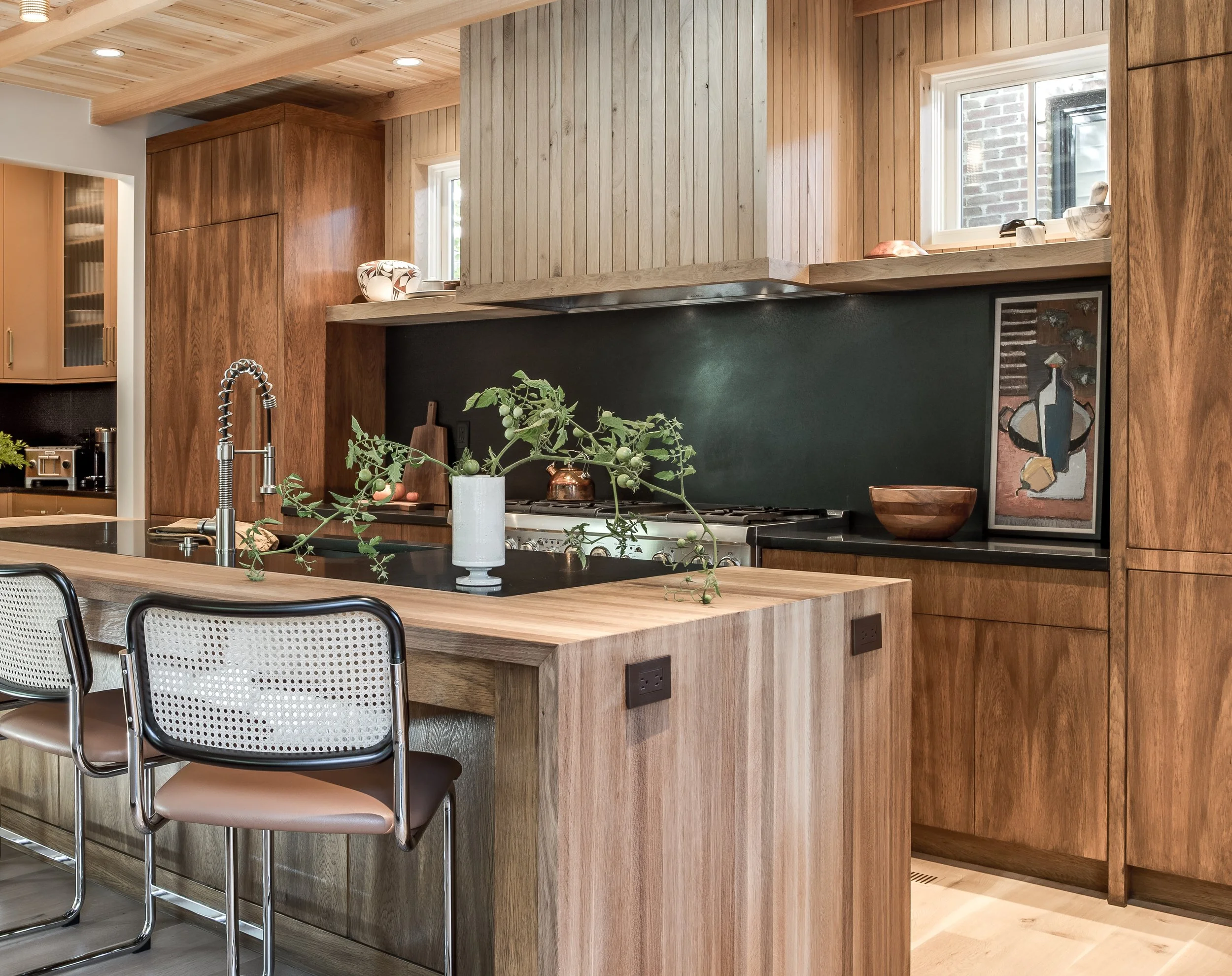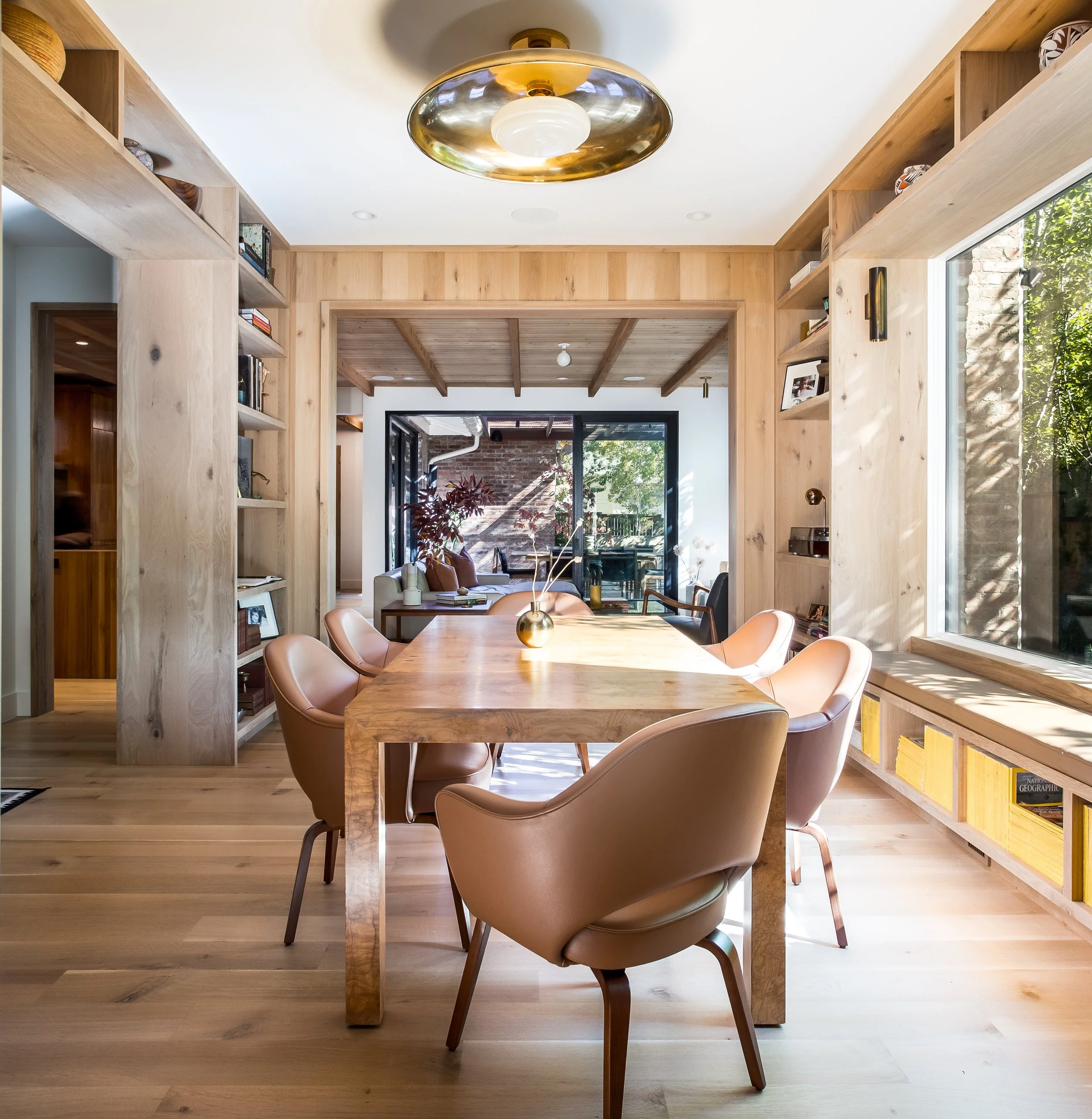 Purchased in 2020, Michael focused on warming up the space by opening up key living and entertaining areas, making the home feel both inviting and functional. The use of recycled brick throughout the exterior adds an eco-conscious touch while maintaining a connection to the neighborhood's historic roots. Inside, the library was transformed into a stunning, cozy space, and natural woods like cedar were incorporated to create an inviting atmosphere throughout the home.
